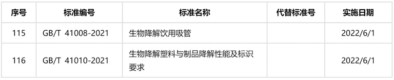 2021年11月26日,國家市場監(jiān)督管理總局、國家標(biāo)準(zhǔn)化管理委員會發(fā)布公告,《GB/T 41010-2021 生物降解塑料與制品降解性能及標(biāo)識要求》、《GB/T 41008-2021 生物降解飲用吸管》兩個國家推薦性標(biāo)準(zhǔn)將于2022年6月1日實施。 關(guān)于GB/